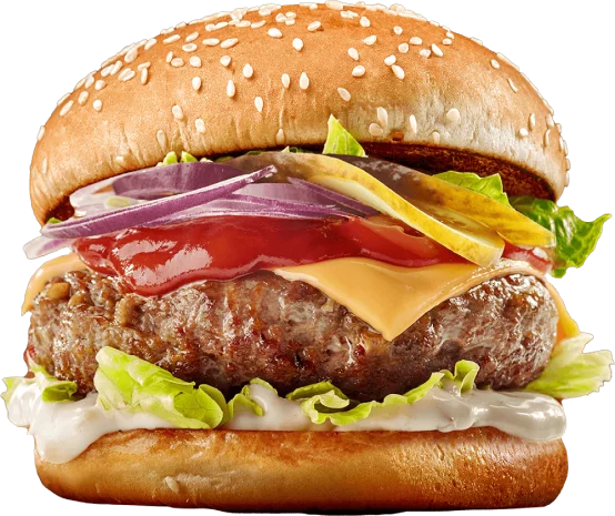 Царски бургер за гладни хора. Промоция – ако поръчате картофки, получавате безплатна Кола.
